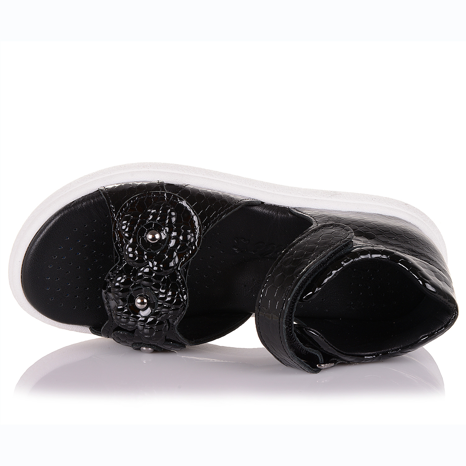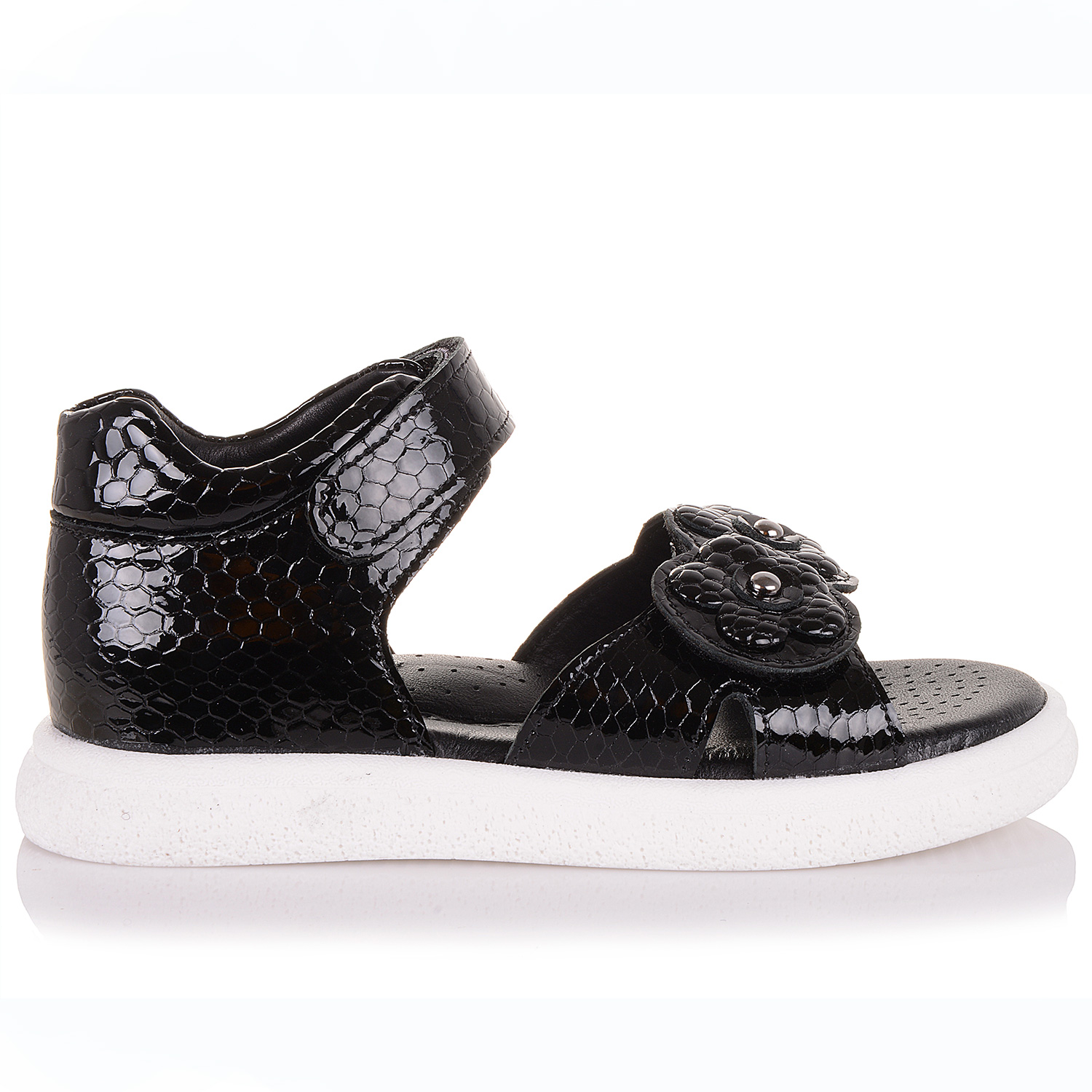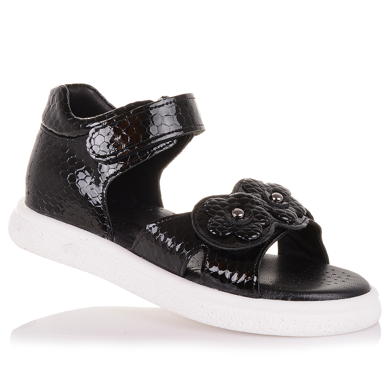 Ця модель прекрасно підійде тим, хто бажає купити дитяче взуття відкрите та комфортне. Босоніжки для дівчат виконано з чорної лакованої текстурної шкіри. Устілка також шкіряна, із супінатором для підтримки суглобів маленької ніжки у вірному положенні. Фіксується взуття для дитини за допомогою ліпучки на щиколотці. Передня шлейка не регулюється, вона прикрашені квітами із металевими скобами. Підошва класична, з термоеластопласту, не буде ковзати навіть на мокрій плитці. До того ж вона міцна та стійка до зносу.
