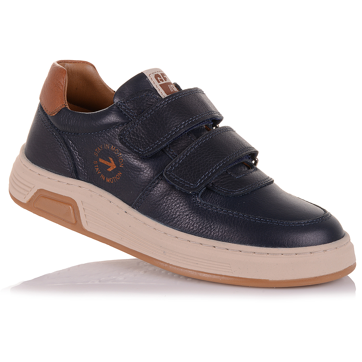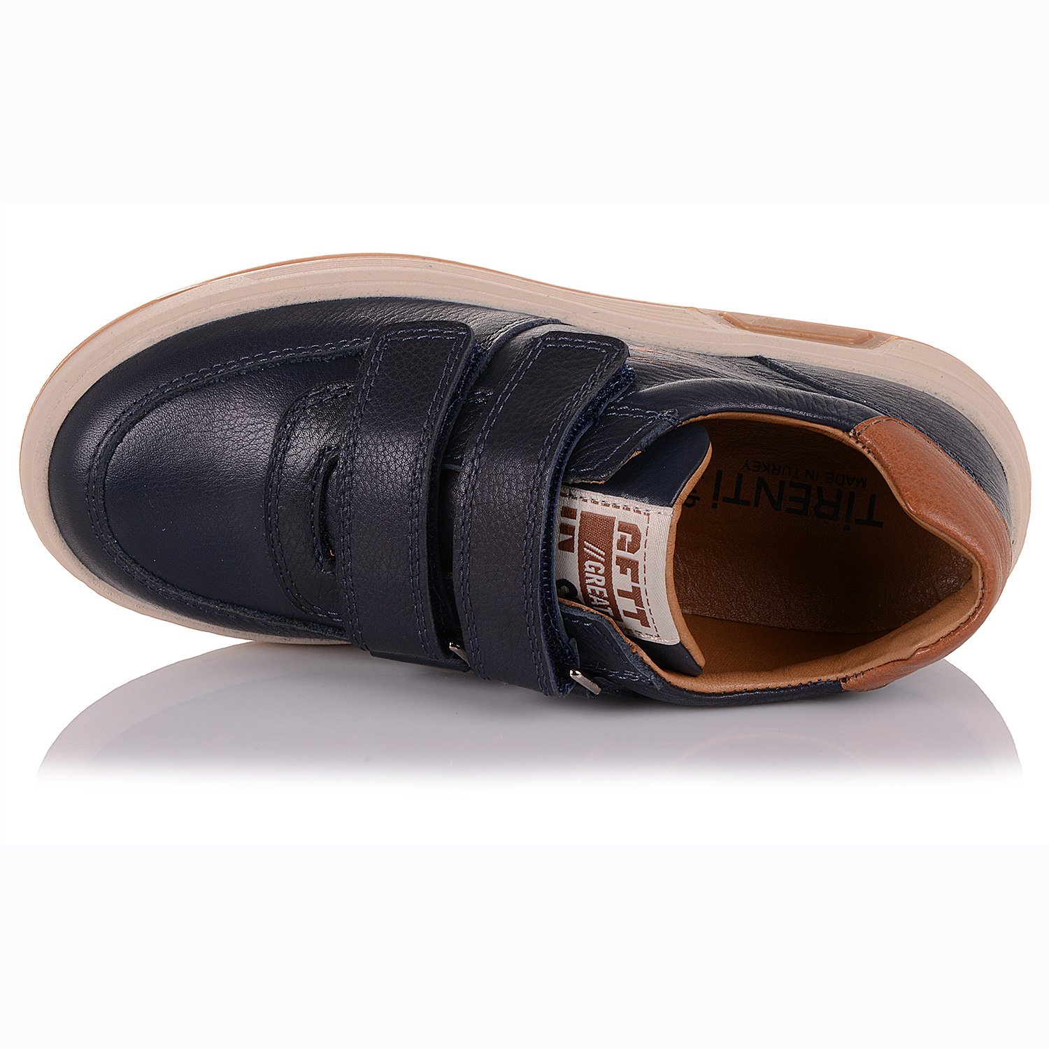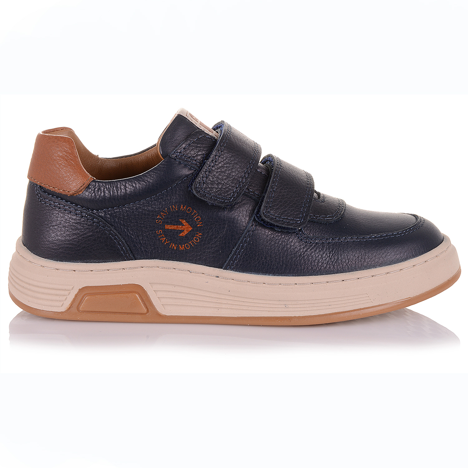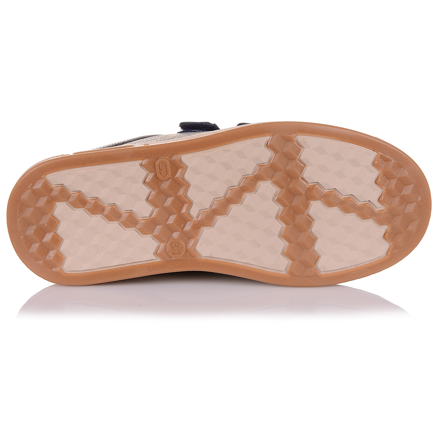 Взуття для дітей зроблено з натуральної шкіри темно-синього кольору. Середина і устілка зроблені з коричневої шкіри. Підошва практична, бежево-коричнева, з термоеластопласту, не важка і має чудові експлуатаційні властивості. У якості застібок використали дві зручні липучки. У молелі відсутні супінатор та потовщений задник!