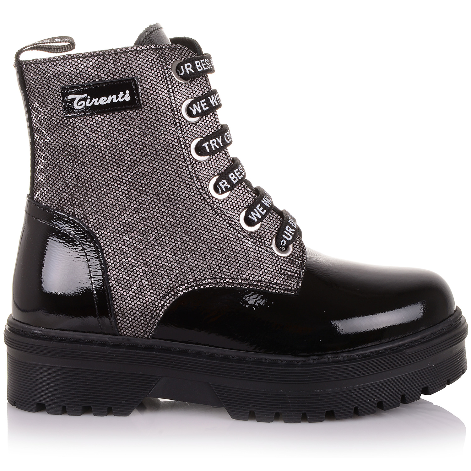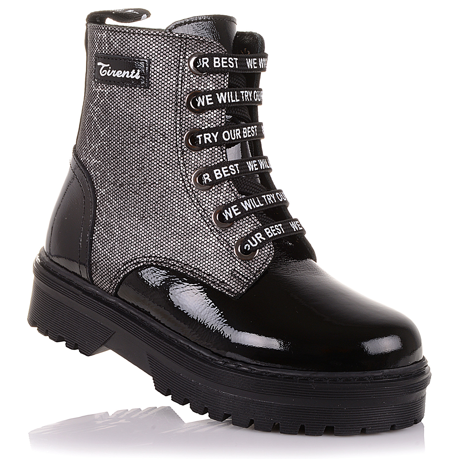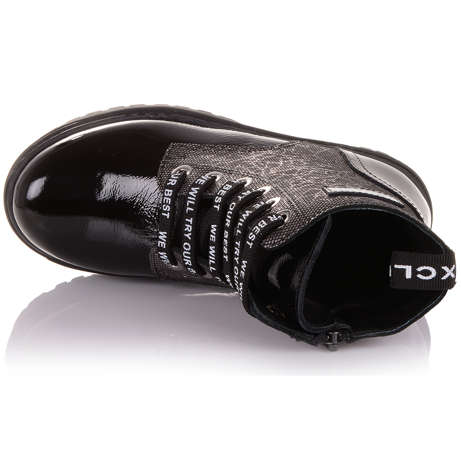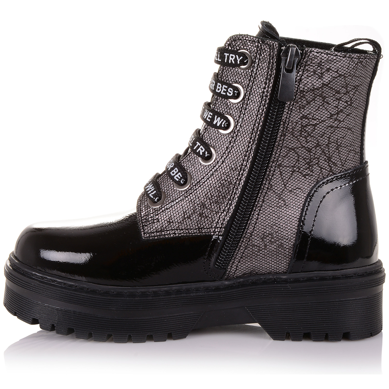 Демісезонне взуття порадує чудовою практичністю і зручністю під час носіння. Взуття для дітей виготовлено з лакової шкіри в поєднанні з нубуком. Устілка, а також внутрішня частина взуття виготовлена з флісу, який утримує тепло і дозволяє дитячим ніжкам залишатися сухими в холодну дощову погоду. Черевики надійно фіксується на ногах за допомогою шнурків і бічний блискавки.